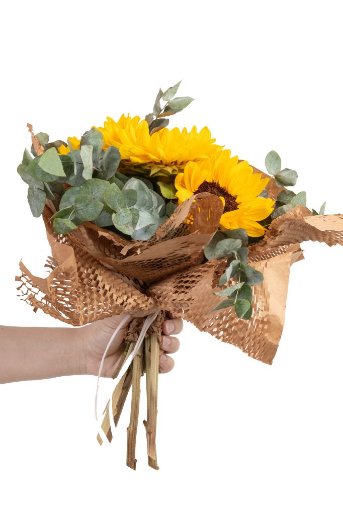 • il numero dei fiori varia a seconda della dimensione del mazzo scelto: nel mazzo standard utilizziamo 5 girasoli abbinati a qualche fiore bianco, il mazzo large contiene 9 girasoli abbinati a qualche fiore bianco.