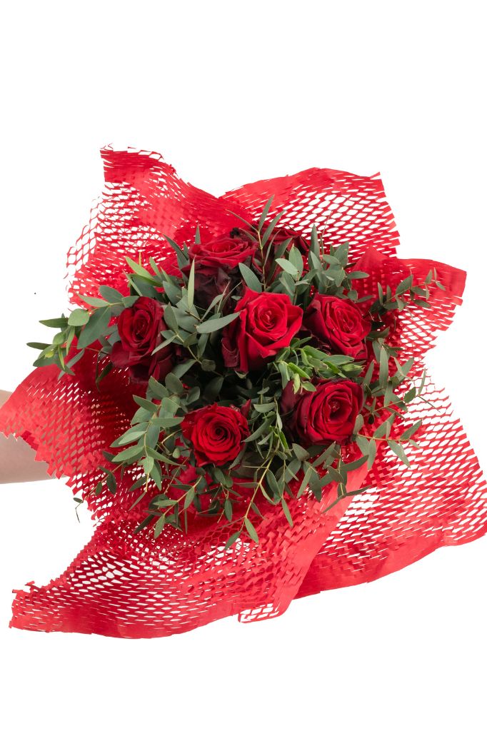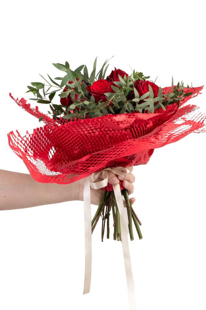 Un eterno classico che non passa mai di moda. Il colore rosso intenso delle rose viene esaltato dal verde floreale a nostra scelta.